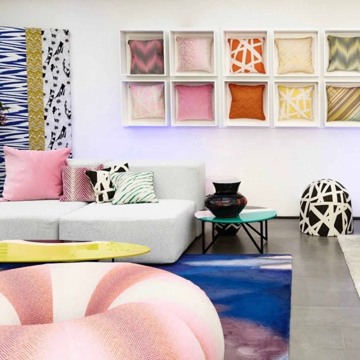 A coleção de Rosita Missoni afirma-se pela cor e habilidade de produção, reflexo de uma personalidade ensolarada e espírito criativo. A linguagem da marca é inconfundível, construída em torno de interações livres entre cores e formas. O tema recorrente dos tecidos e as suas inúmeras texturas, representam um convite a mobilar a casa por dentro e por fora.